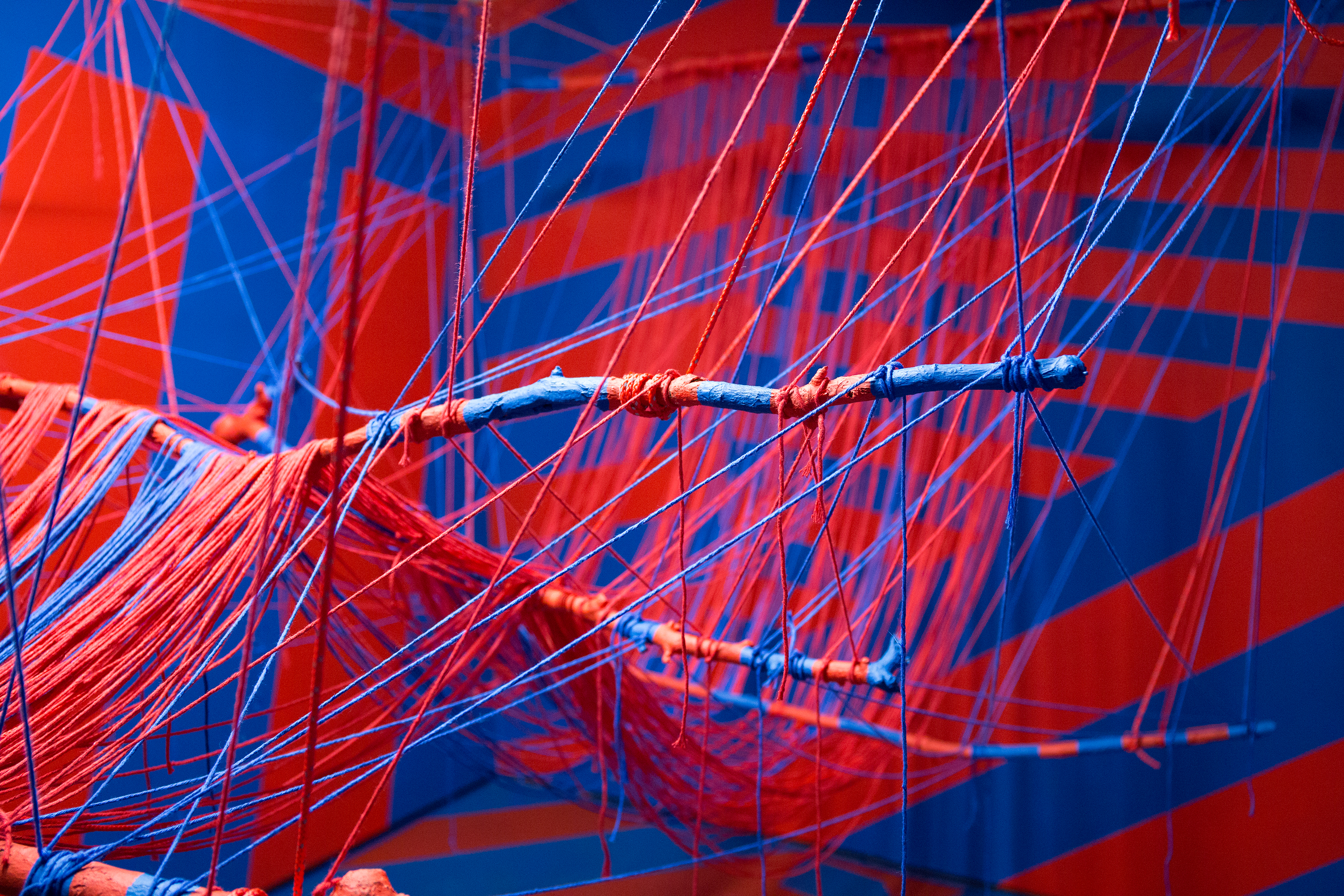Nie pamiętam momentu, w którym odkryłam malarstwo (dazzle painting) używane do kamuflażu bitw morskich w czasie I Wojny Światowej, nie w celu ukrycia okrętu, ale dezorientacji obserwatorów. Informacja przenika od oka do mózgu, mówiąc nam o wielkości, kierunkach, czy tworzywie, a także o tym kim i czym coś jest, i w jaki sposób odczuwa. Malarstwo to jest wzorem, motywem, który powoduje zaburzenia wizualnej percepcji w celu dezorientacji. Ale być może to, co naprawdę czyni, podkreśla różnicę między tym, co widzimy, tym, co wiemy, a tym, w co wierzymy.Maszyna jest powrotem do podstaw i początkiem. W przestrzeni zajmowanej przez dwoistość, między granicami czerwieni i błękitu, tego, co digitalne i analogowe, organiczne i nieorganiczne, doświadczamy rozmycia. Jest to rozmycie między liniami i słowami jak technologia, percepcja, forma, kolor, funkcja, sieć, czas, przestrzeń, horyzont, zniekształcenia. Raz, dwa, trzy. Światło, przestrzeń, czas. Początek, rozwinięcie, zakończenie. Czerwony, żółty, niebieski.