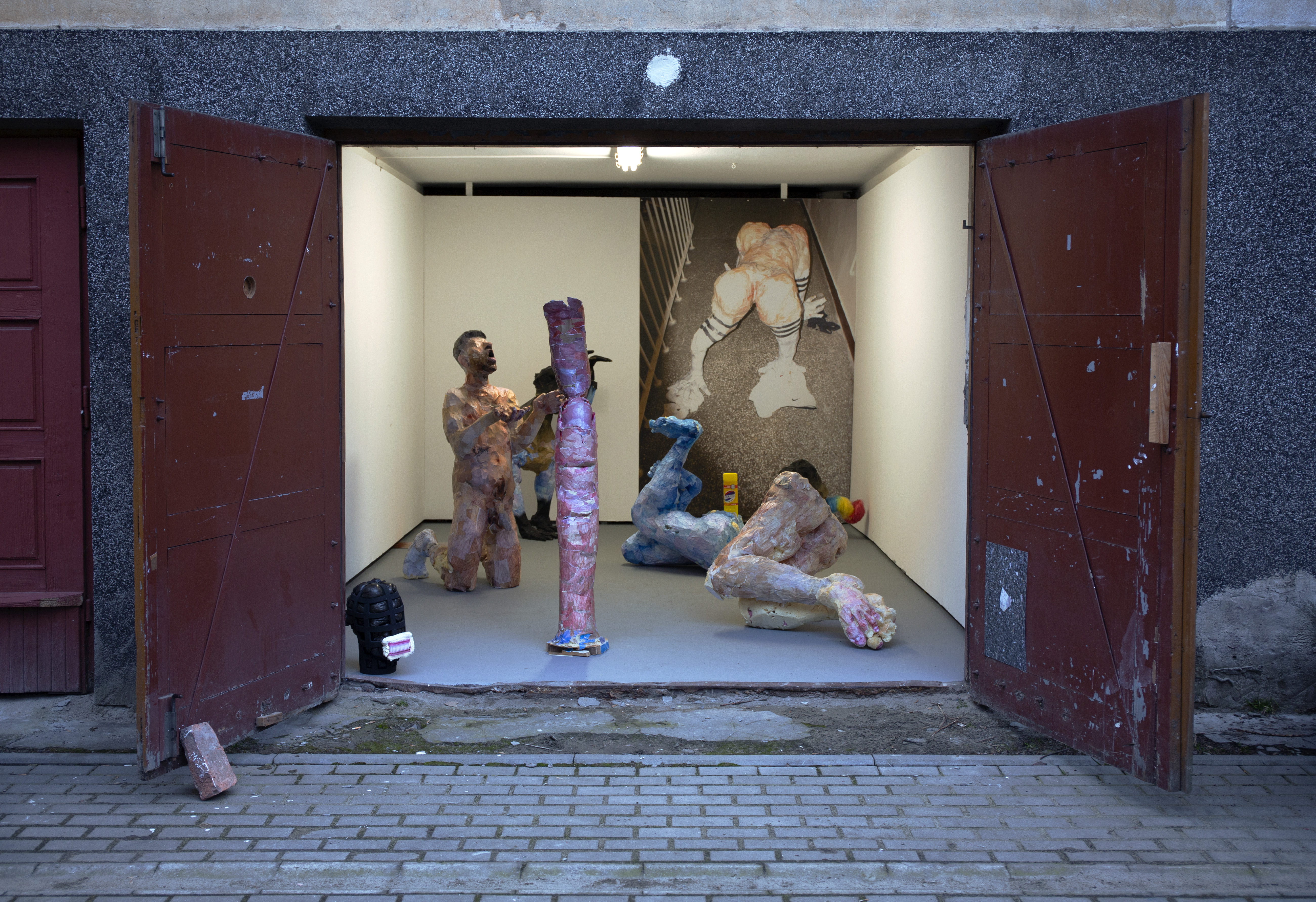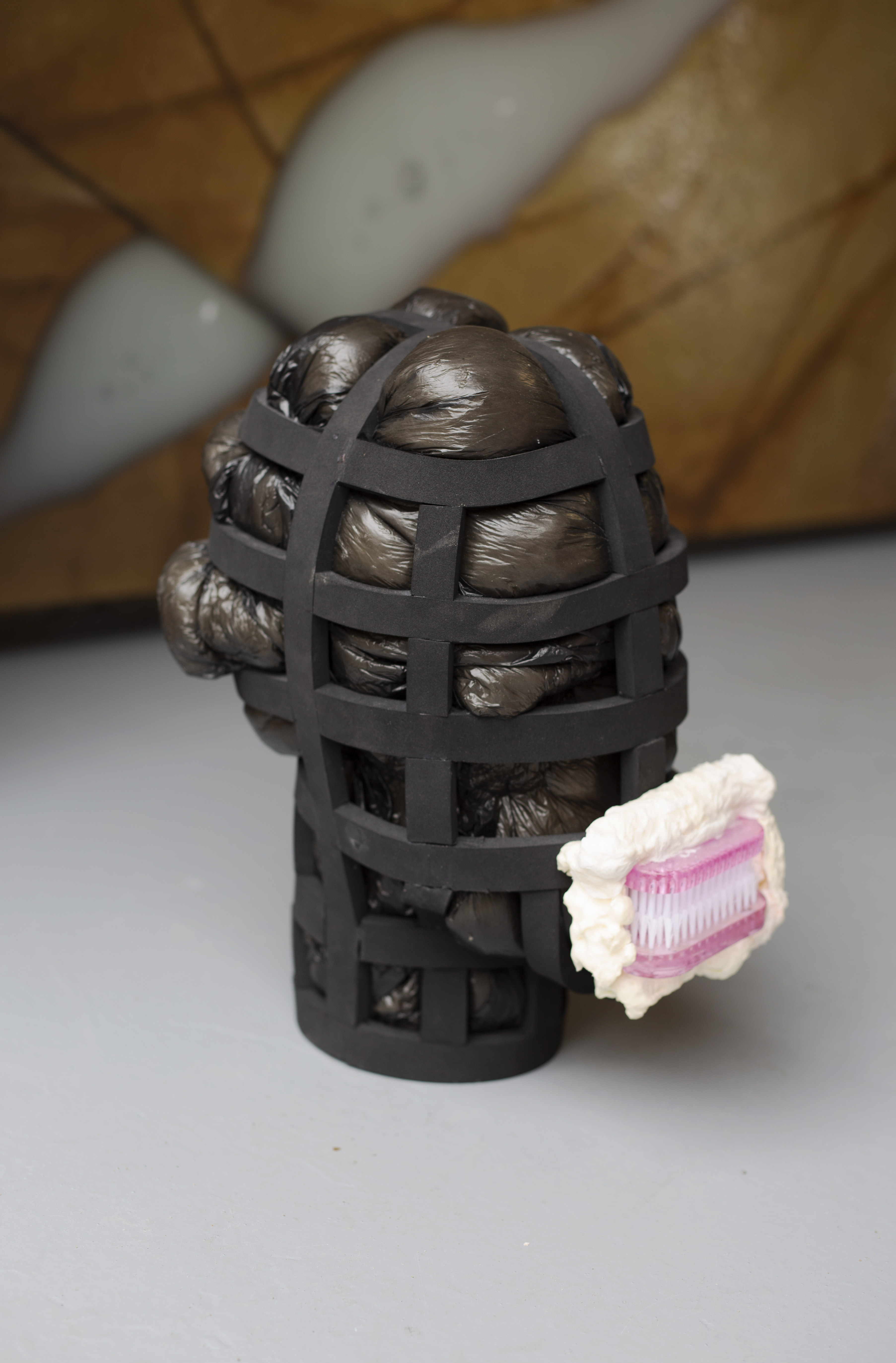 These two experiences merge on the skin, the body's protective layer, and are solidified on the surface of the sculptures as collages of images of exclusion. The objects reveal the experience of fighting physical filth and the struggle against the socially imposed sense of shame associated with both homoerotic desire and economic exclusion. They are a reaction to the shaping and marginalization of non-heteronormative bodies by heteronormativity and to the consequence and invisibility of precarious work.